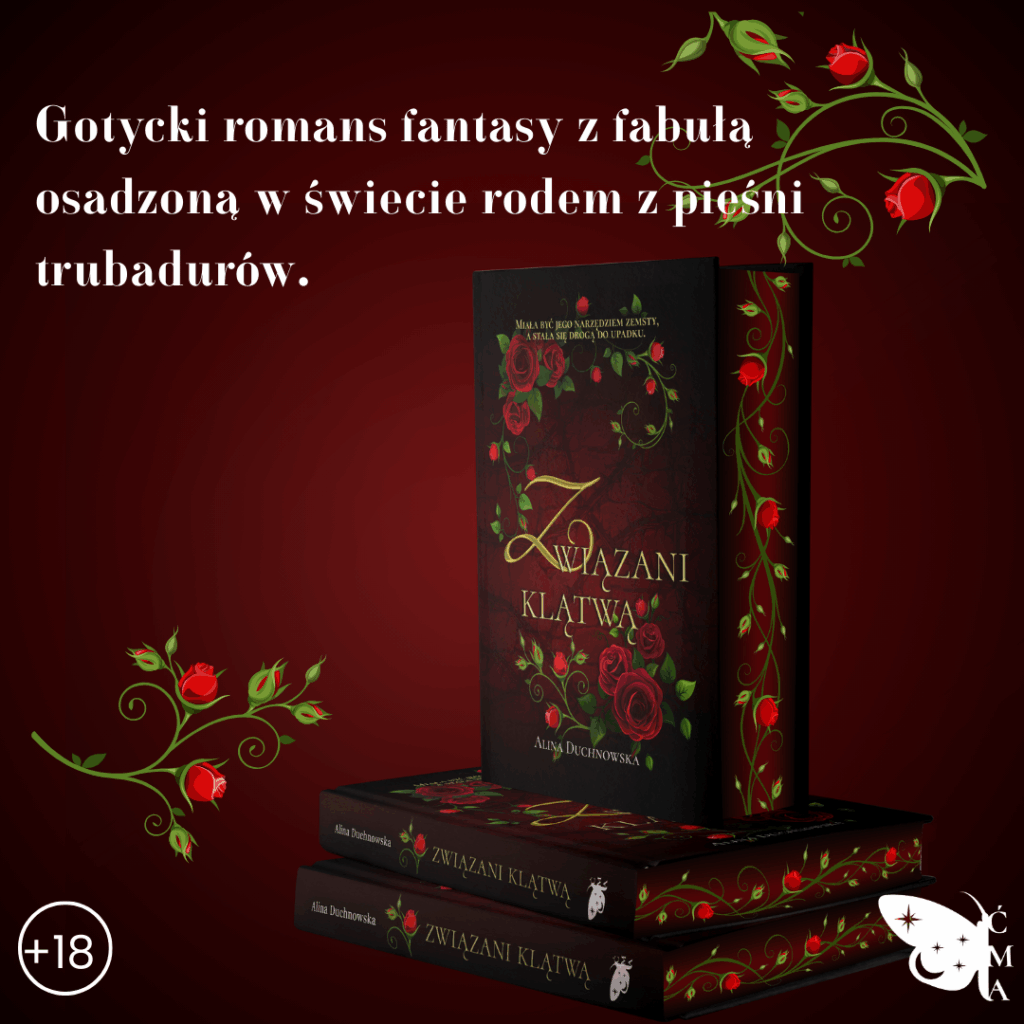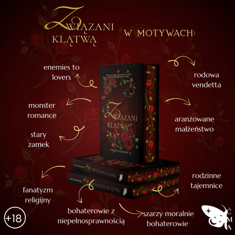 Z radością dzielmy się z Wami naszą pierwszą zapowiedzią wydawniczą. Jeśli lubicie bardzo mroczne romantasy, tęsknicie za historiami nawiązującymi do „Pięknej i Bestii”, ta pozycja może być dla was. „Związani klątwą” to powieść eksplorująca motyw od nienawiści do miłości, poruszająca niezwykle trudny, a często obecnie romantyzowany temat wymuszonego małżeństwa. Autorka nie cofa się przed nawet najtrudniejszymi scenami i rozważaniami prowadząc nas przez mroczną i łamiąca serca historię bohaterów. Tutaj nienawiść, zdrada i niebezpieczeństwo czają się na każdym kroku.